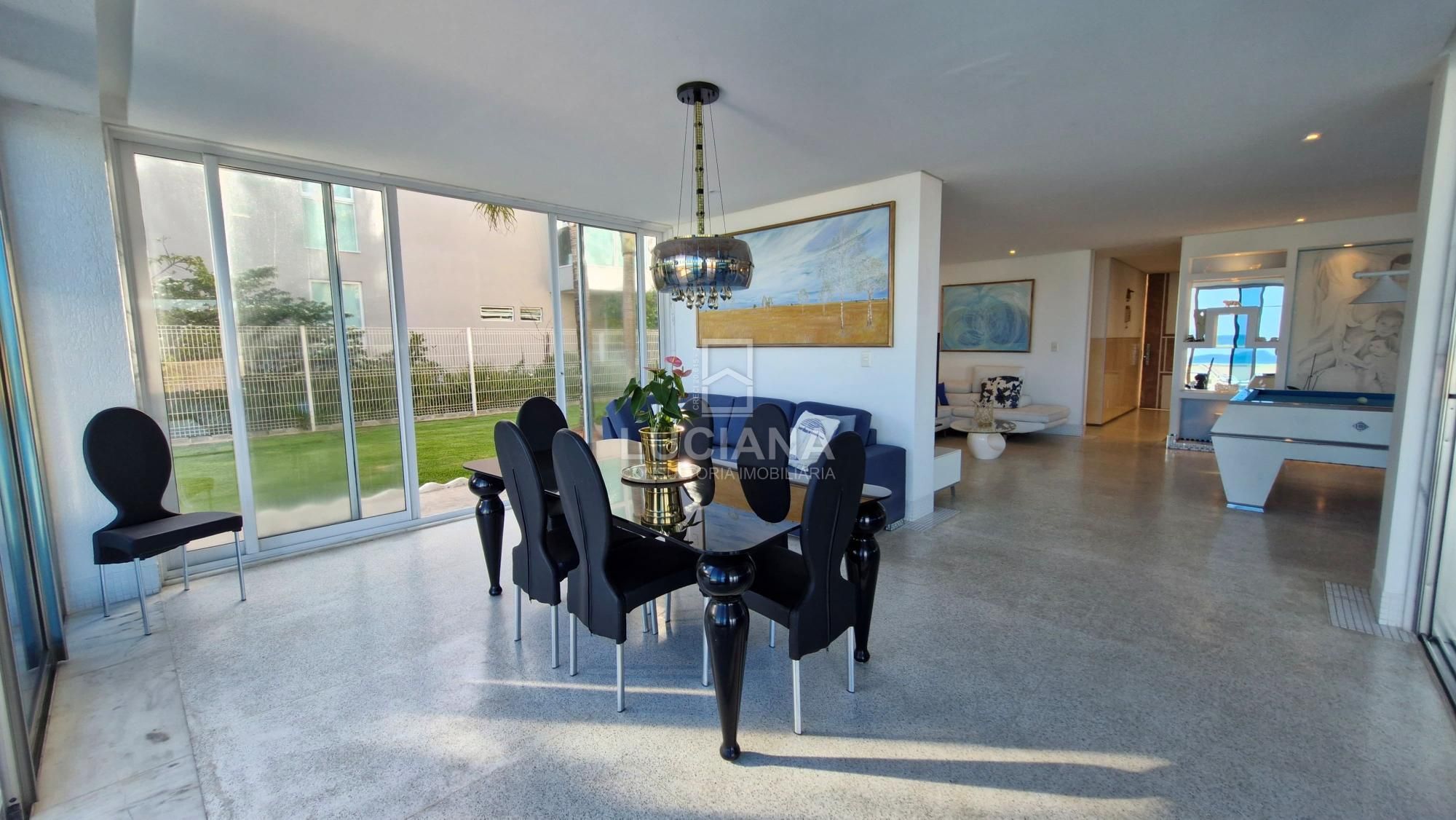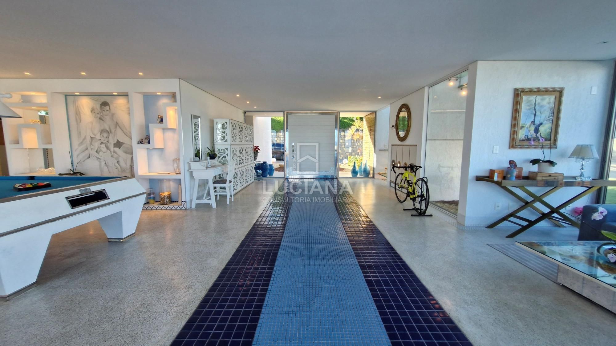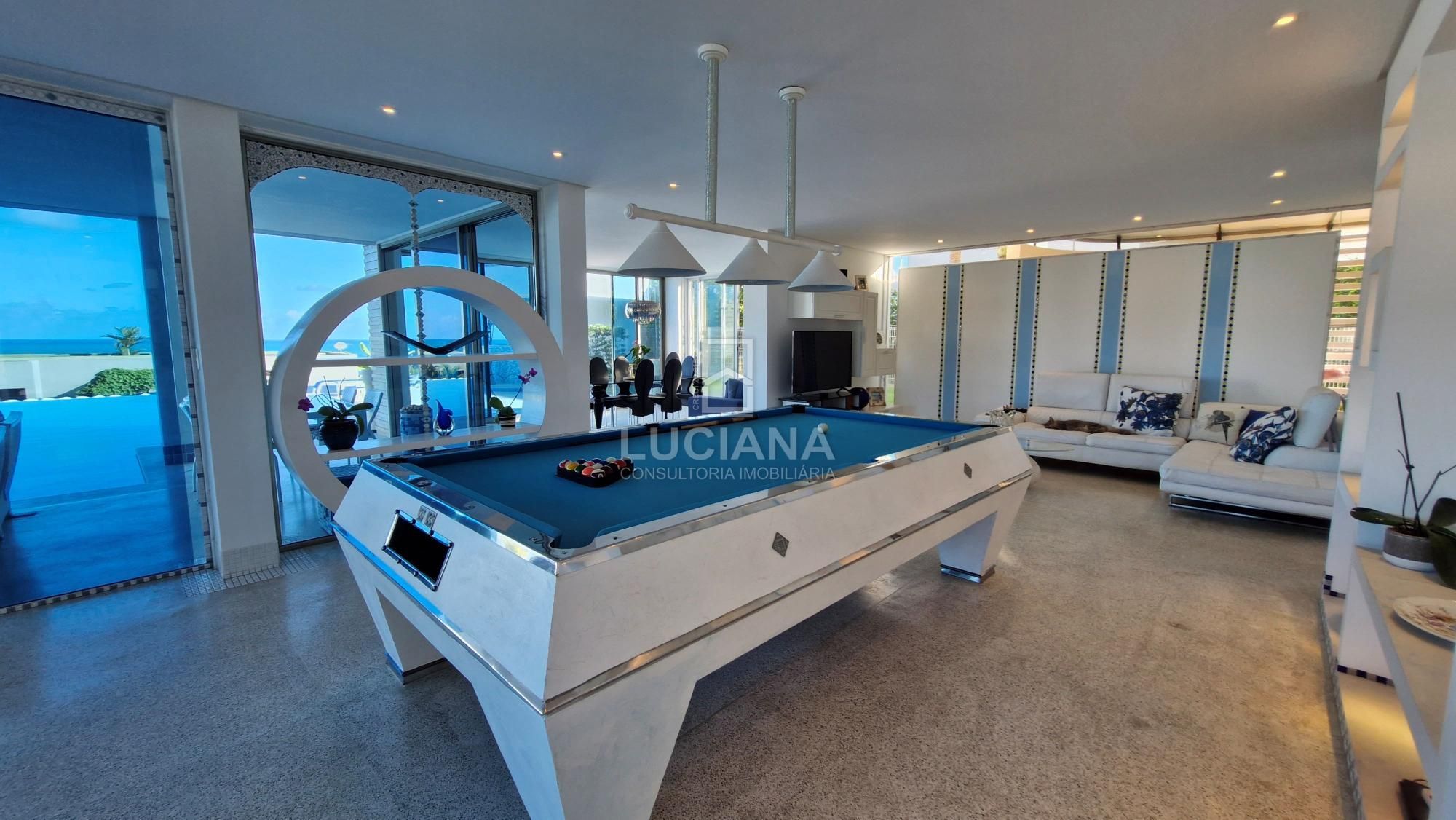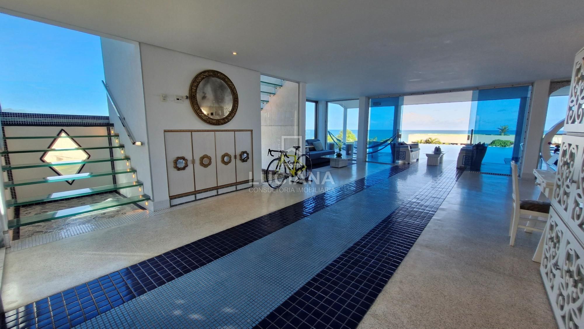No andar térreo encontramos uma ampla entrada com vista direcionada para o mar, uma ampla varanda, sala jantar, sala estar com uma sinuca com pano azul e detalhes em aço polido, cozinha com móveis planejados e equipamento elétrico completo, despensa, área serviço, local para armazém e depósito materiais, garagem de três vagas e local de churrasqueira/área gourmet com banheiro. Piscina de 168m² com a prainha, com borda infinita e vista do mar tem uma iluminação colorida a LED e dispõe de um sistema ecológico de filtragem e reutilização da água.