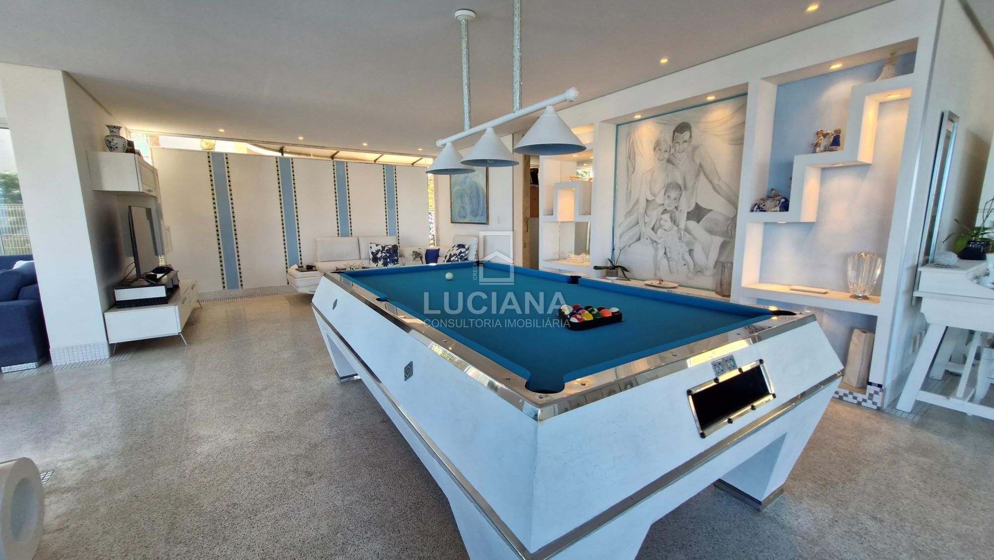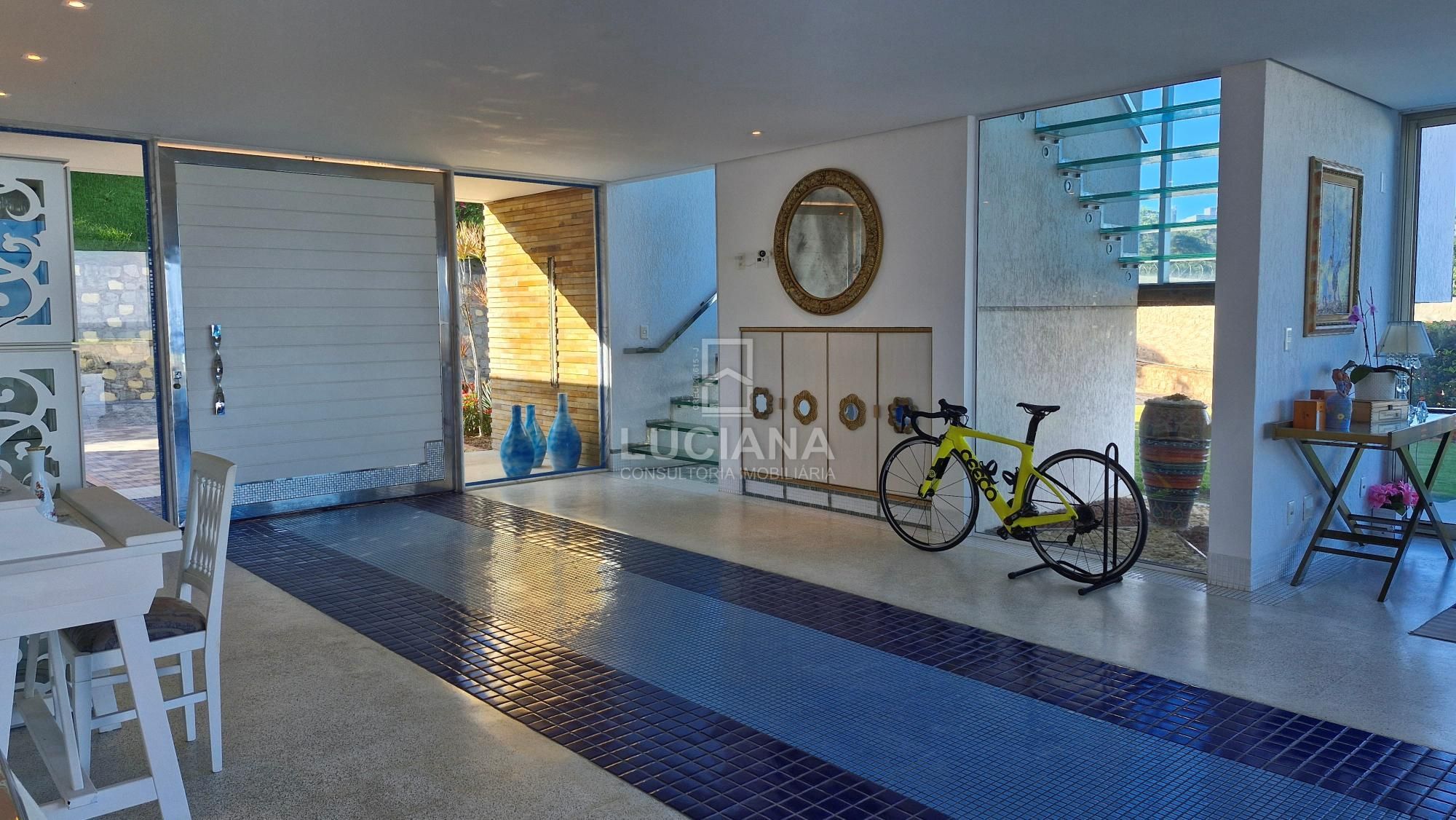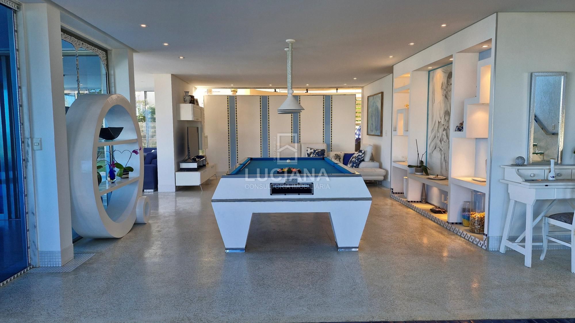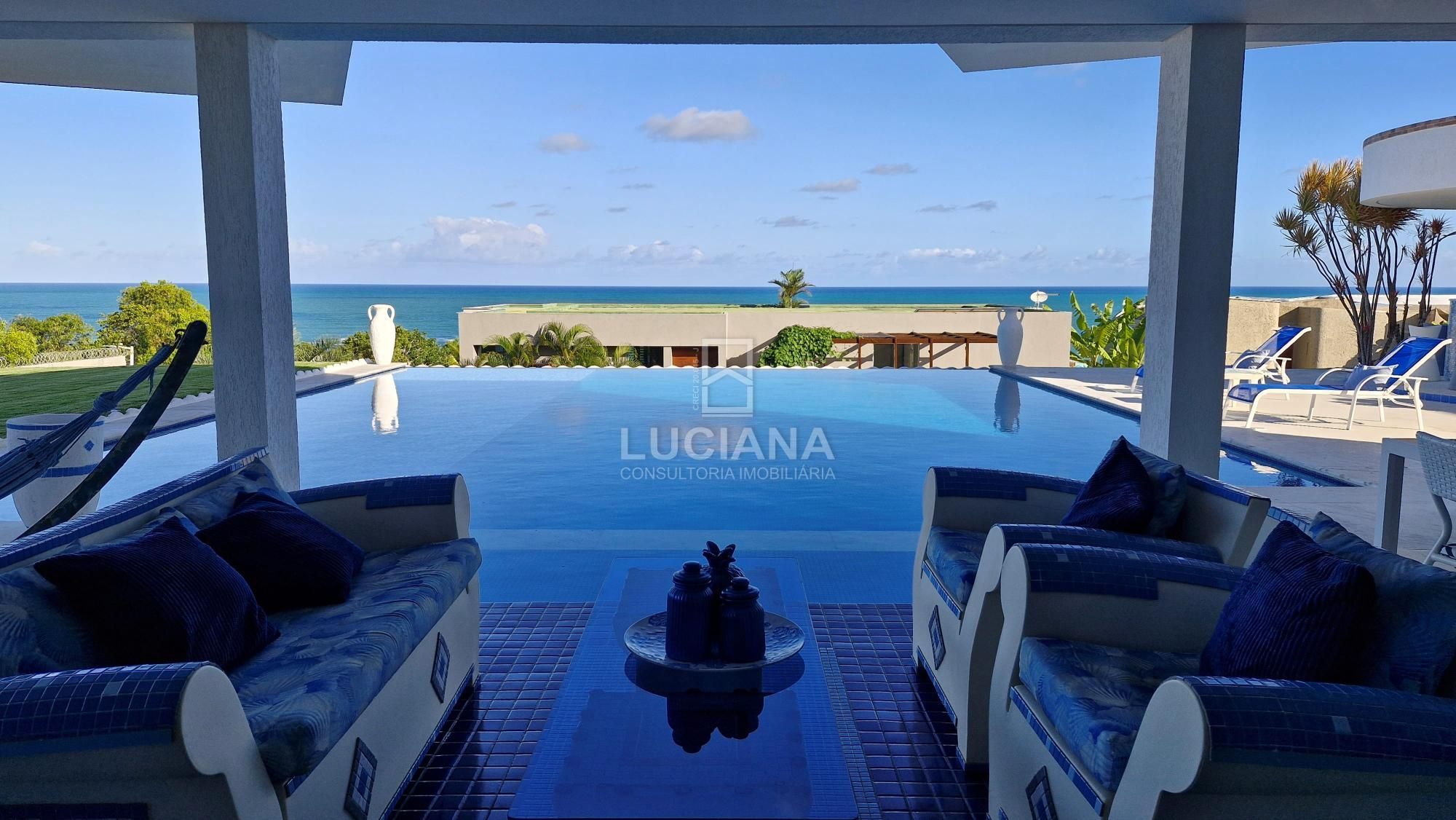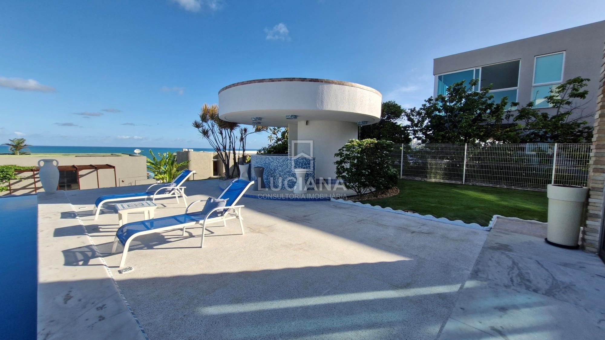 No andar térreo encontramos uma ampla entrada com vista direcionada para o mar, uma ampla varanda, sala jantar, sala estar com uma sinuca com pano azul e detalhes em aço polido, cozinha com móveis planejados e equipamento elétrico completo, despensa, área serviço, local para armazém e depósito materiais, garagem de três vagas e local de churrasqueira/área gourmet com banheiro. Piscina de 168m² com a prainha, com borda infinita e vista do mar tem uma iluminação colorida a LED e dispõe de um sistema ecológico de filtragem e reutilização da água.