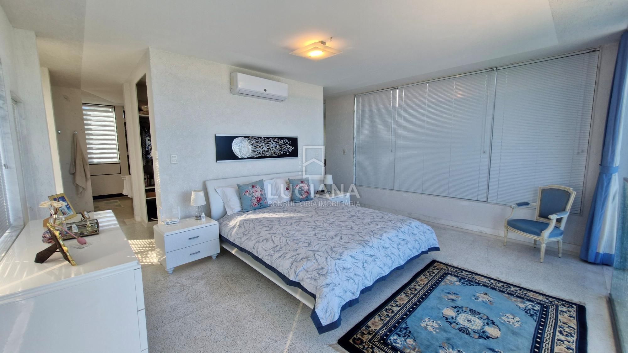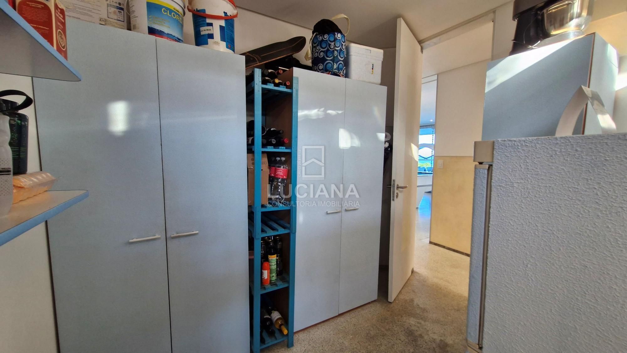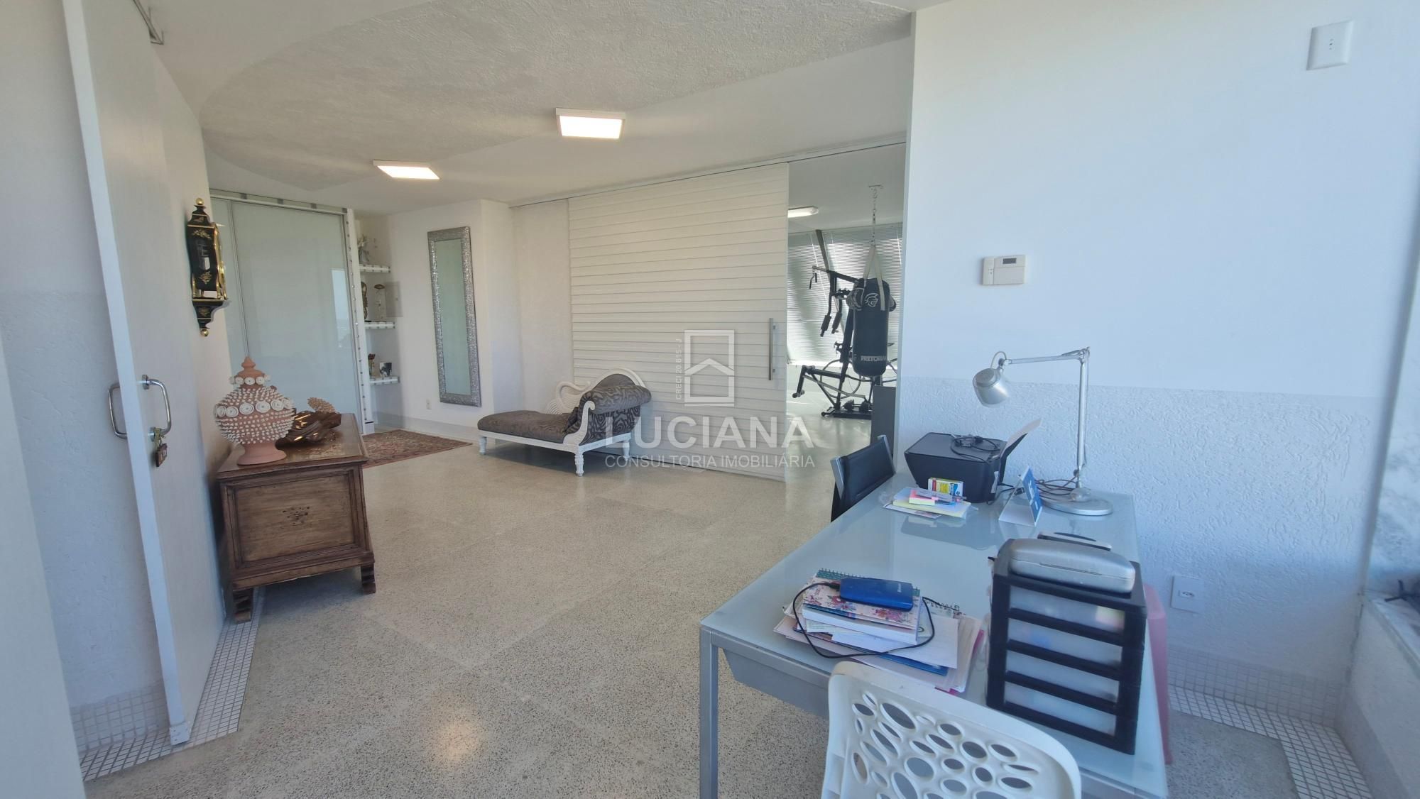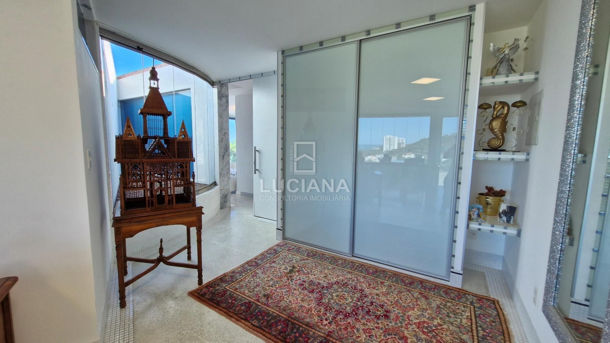No andar térreo encontramos uma ampla entrada com vista direcionada para o mar, uma ampla varanda, sala jantar, sala estar com uma sinuca com pano azul e detalhes em aço polido, cozinha com móveis planejados e equipamento elétrico completo, despensa, área serviço, local para armazém e depósito materiais, garagem de três vagas e local de churrasqueira/área gourmet com banheiro. Piscina de 168m² com a prainha, com borda infinita e vista do mar tem uma iluminação colorida a LED e dispõe de um sistema ecológico de filtragem e reutilização da água.