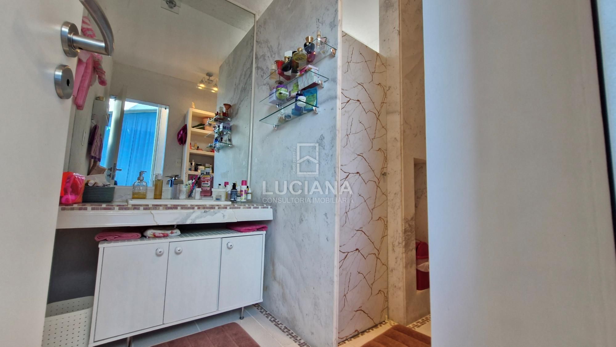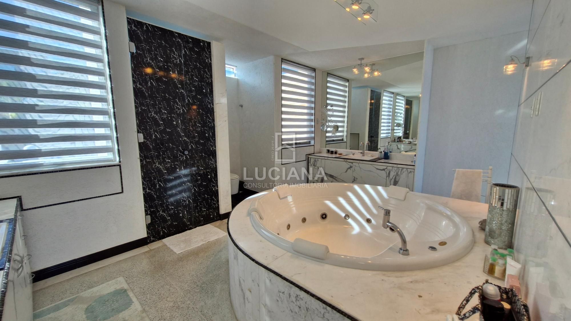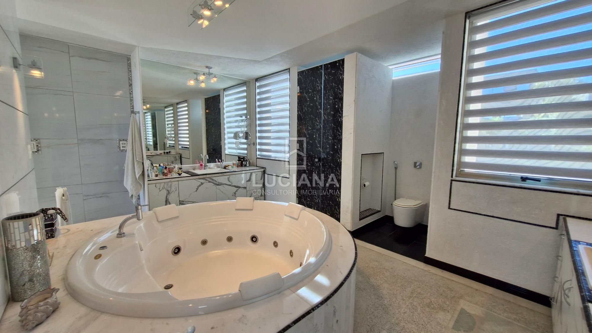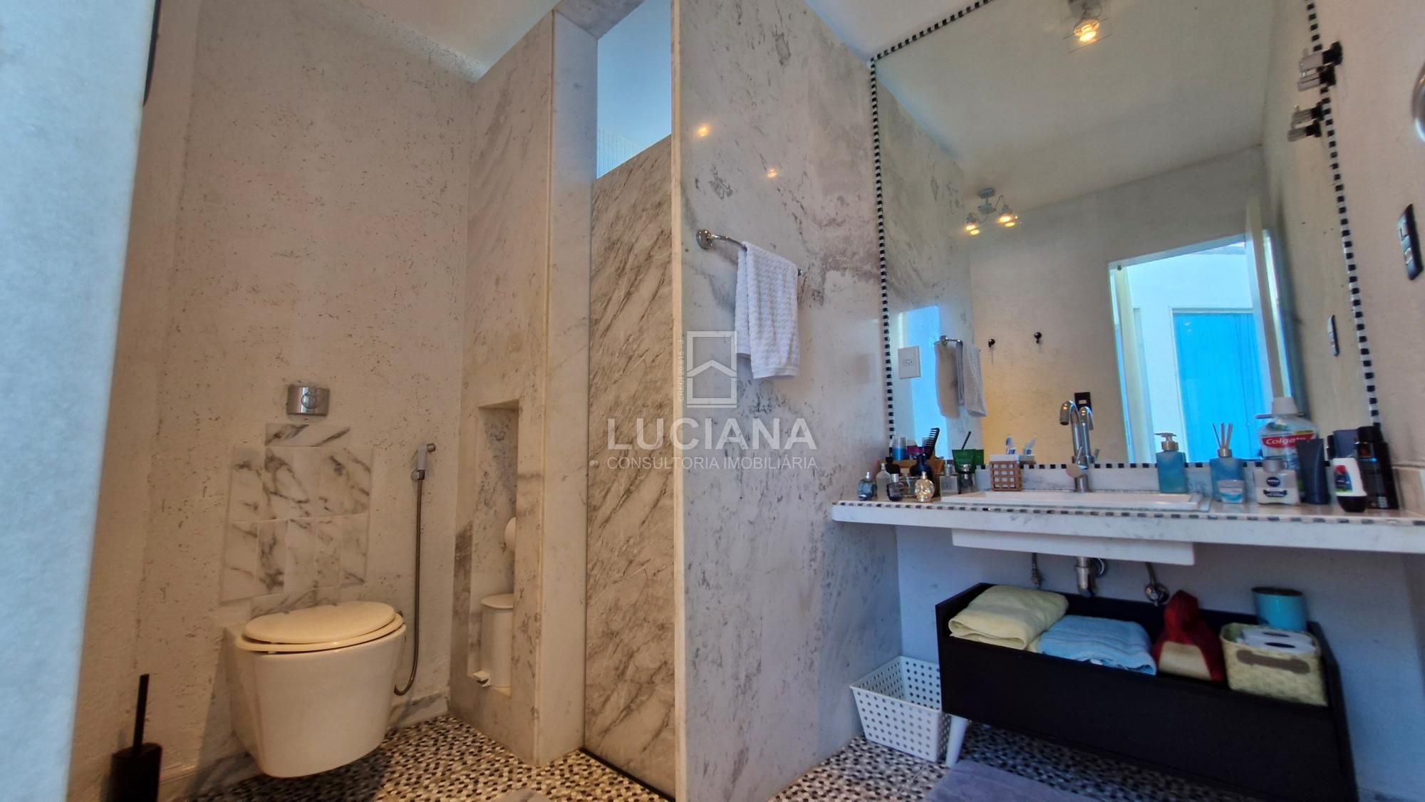 No segundo andar, 3 quartos sendo suítes, com closet masculino e feminino separado, uma banheira Jacuzzi e duas pias com bancadas em mármores de Carrara branco e espelhos, sanitários suspensos, pias com escoramento de água escondido, materiais e acessórios de primeira linha.