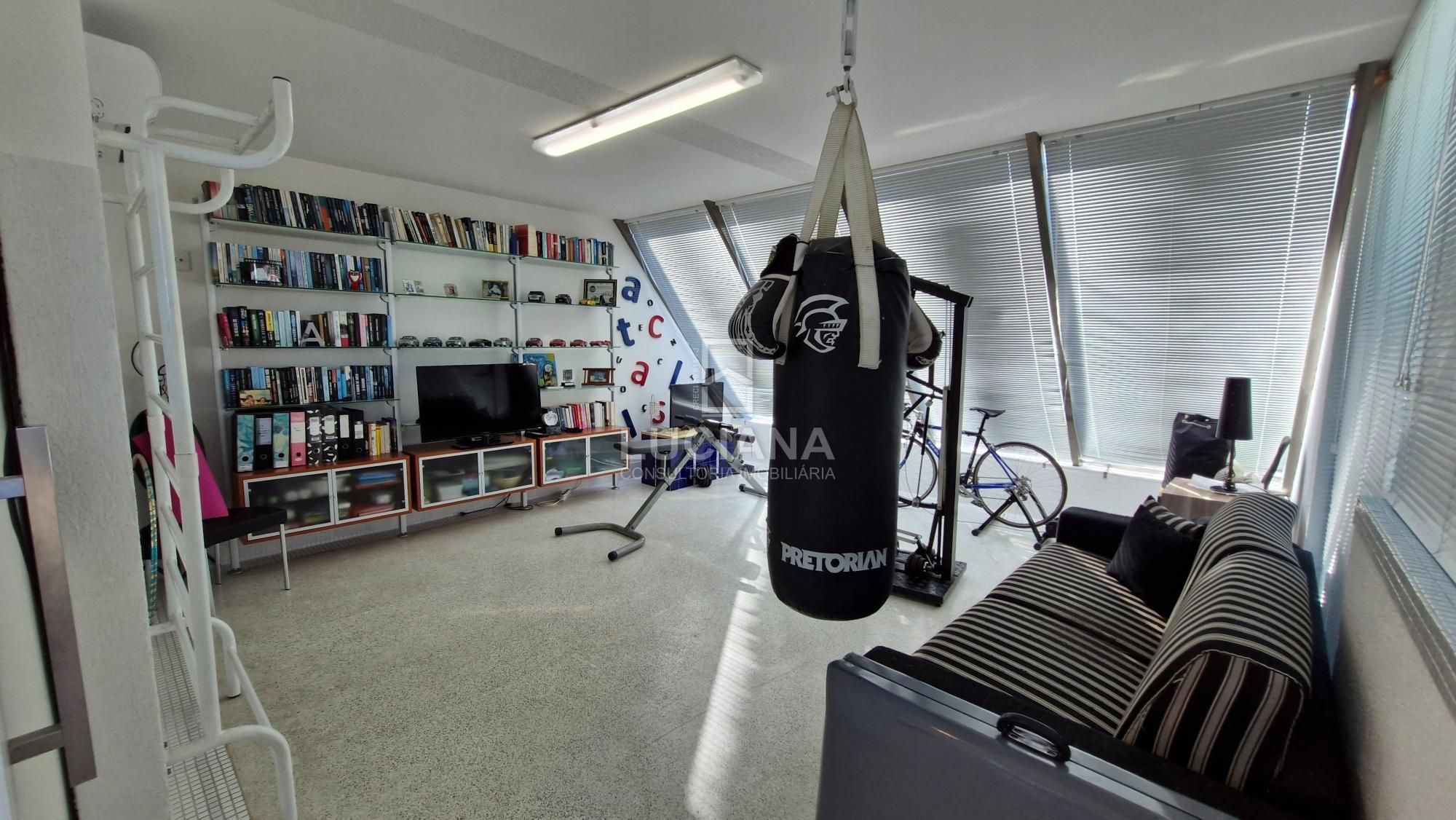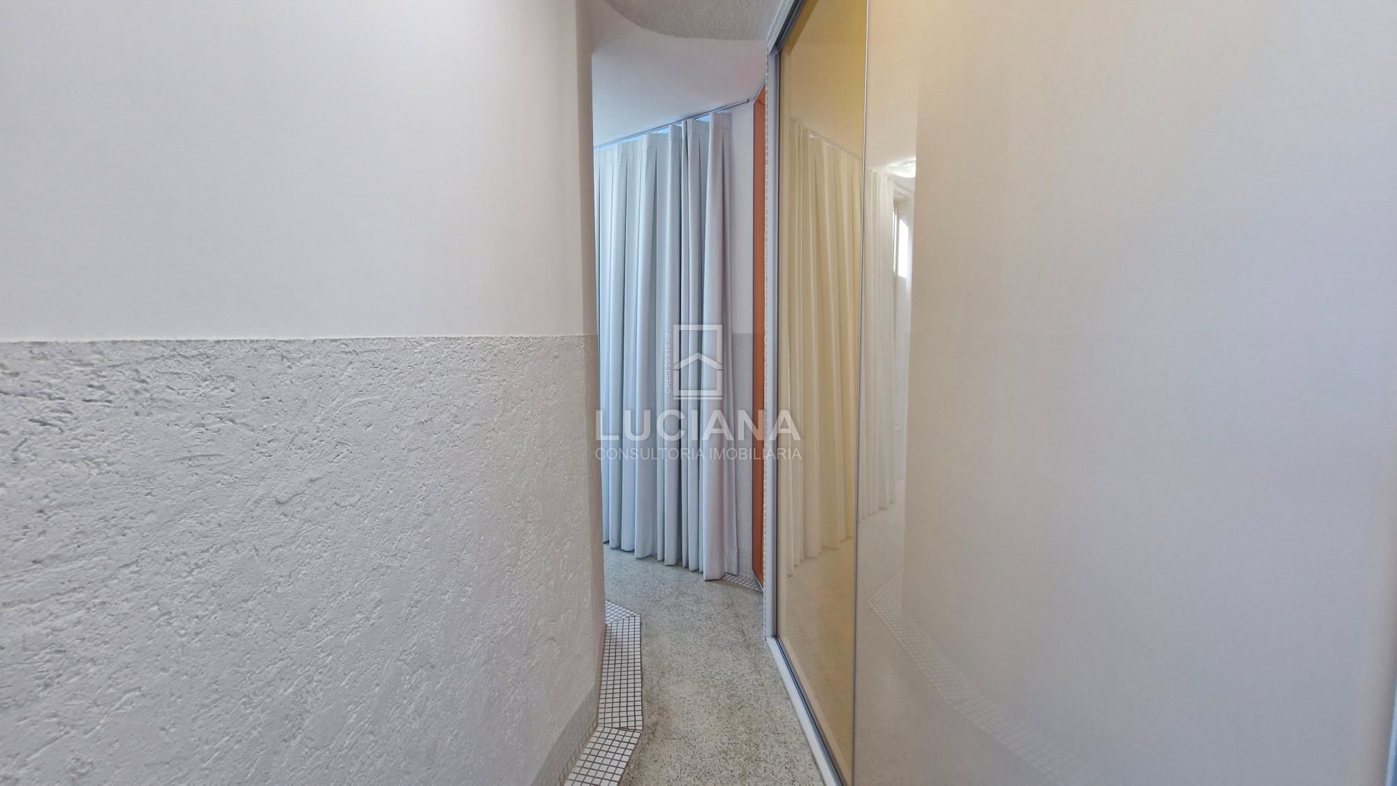 Completa um amplo corredor como área descanso, uma jardineira externa e uma academia.